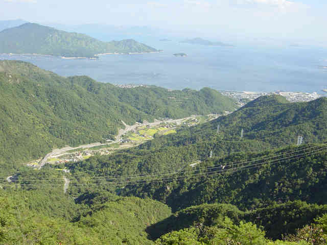 瀬戸の展望(大竹方面) 大竹の市街を展望するとその先には周防大島の嵩山を確認することができる。今日は空気が澄んで遠くまで見渡すことができる珍しい日だ。出発から25分で展望の岩に着き、美しい瀬戸内海の展望を楽しむ。更に20分で反射板近くの526峯ピークに立ち、眼下の広島市街の景色を楽しむ。