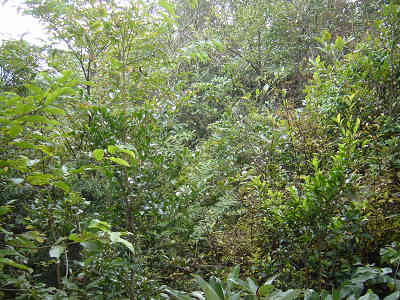 大谷山から次の西山に向かうには、大谷山山頂で右折するように、唯一展望の開けた方向の如意岳に向かって降りて行くことになる。まずは西山への道を確認するため、急な坂を下りて行くことにした。道は雑草に覆われて非常に歩きにくく、茨が体中に刺さり歩くのに難渋する。手強い道を我慢して降りて行くと急に雑木林となる。ここでようやく一息ついて周囲を見回す。