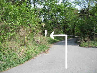 縦走路を進むとすぐに舗装路に出るが、舗装路右側のガードレールの先に再び縦走路の標識を見ることが出来る。この場所からいよいよ舗装路と別れ、大谷山・城山に向かっての長い旅が始まる。