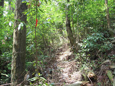 大谷山の分岐から10分で再び案内標識1と出会い、その先6分で進入禁止場所を迂回して右に進路を取る。更に10分で標識2に出会う。赤いテープがあるので道を間違えていないことは分かるが、標識に出会うとやはり安心する。すぐ先には私有地があり、この場所を迂回して道はつけられているようだ。