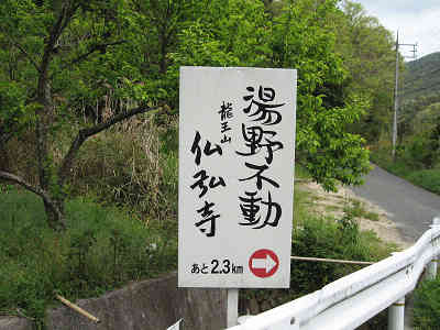 この先は湯野不動「仏弘寺」の標識を見ながら進むことになる。5分程度走ると途中右側に猿田彦太神・八幡宮の石碑を見送り、その先数分で右手に仏弘寺の入口を過ごす。更に県道27号を進むと今度は左側に猿田彦太神・阿弥陀如来等の祠を過ごす。県道を道なりに進んでいると大きく右にカーブする手前に石砂谷橋があり、この橋を渡った先の分岐を左に取り県道と別れる(登山口道標あり)。