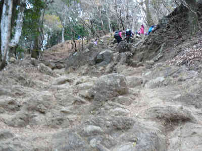 やがて8丁へ着けば夫婦杉が立っている。この木は「樹齢5〜600年を経ている縁起の良い大木」と紹介されている。更に岩の目立つ道は続き、皆さん苦労しながら高度を上げている。背後を振り返れば、少しずつ展望が良くなり、木の間越しながら相模湾方面が見えている。