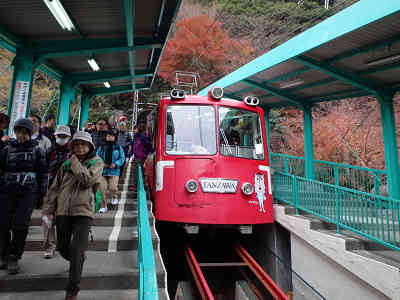 さて、バス停を出発してケーブルカー乗り場へ向かう。参道途中には多くのお店がひしめいているが、朝早い時間には開いている店が少なかった。やがてケーブルカー乗り場へ着き、すぐに往復の切符を購入してケーブルカーへ乗り込む。途中の大山寺駅で2台のケーブルカーがすれ違い、更に上へ進んで阿夫利神社駅へ到着した。