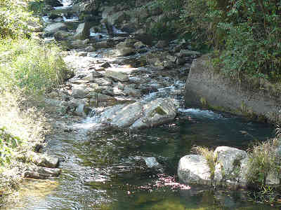 橋を渡り、杉の立ち並ぶ場所を過ごし、その先でススキの中に資材置き場を見る。馬ノ原雨量観測局の先にある橋から川を見下ろすと、川底の岩が茶色になっていた。この辺りは鉄分が多いのかもしれない。舗装道をもう少し進むと駐車地に到着、これで一周回りの山歩きは無事終了した。