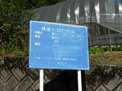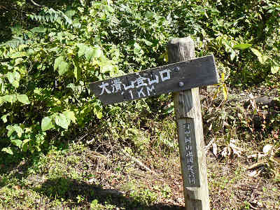 国道186号を南東方面に引き返し、民宿「うめだや」手前より林道水越亀山線に入る。舗装された林道を進むと右手に「大潰山登山口1.1km」標識が立っている。更に馬ノ原雨量観測局の施設を右に過ごし、舗装道を進むと右手に広場が現れ、広場先の左手には大潰山頂の案内標識が立っていた。広場に車を置き、標識に従い山道に入るとすぐに沢を渡る。周囲には小石が多いので滑らないよう慎重に進む。沢沿いに歩いていると左手に小さな滑滝を見る。