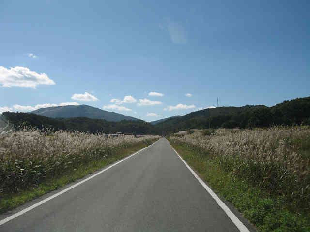 次の分岐は右折しそのまま県道114号を走り続けると左右にススキが美しく、左手に雄大な掛頭山が広がる。間もなく国道186号に合流、大佐山スキー場の標識に従い右折する。すぐに大佐山スキー場の駐車場に着くが、大佐山スキー場付近から大潰山への登山口が分からない。