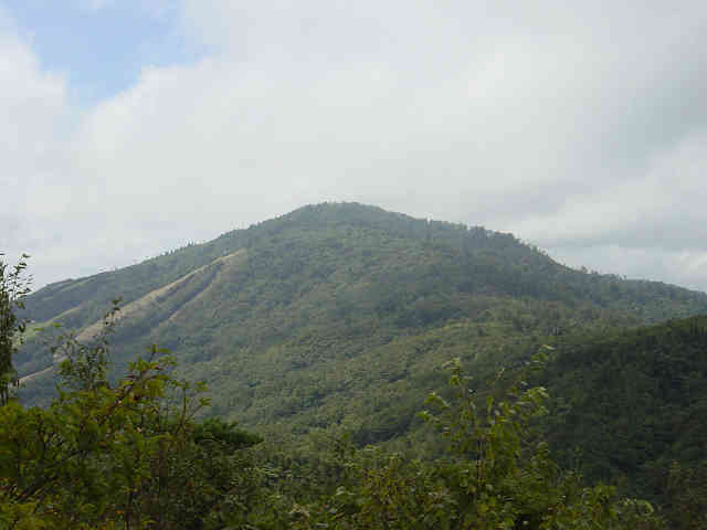 新緑のブナ林の中を降りて行く この分岐を夏焼峠方面に降りて行く。綺麗な新緑のブナ林の中を降りて行くのがとても爽快だ。分岐点から30分で夏焼峠に到着し砥石郷山を目指す。小さな砥石郷山への道標を見つけ快調に歩いて行く。木のトンネルを抜け、最初のピークに出ると恐羅漢山がとても綺麗だ。ここからの展望はとても開けており、いつまで見ていても飽きない。