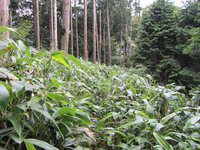 間もなく植林帯に入れば終点は近い。そのまま道なりに坂を下り、急坂をブレーキを掛けながら下れば、やがて屋敷林道へ到着した。到着した場所は国道315号から700m地点で、奥の林道分岐からは500mの位置である。なお、谷コースの入口は、下山した場所から国道方面へわずかに戻り、コンクリートの橋を越え、左側に広い場所のある地点であった。