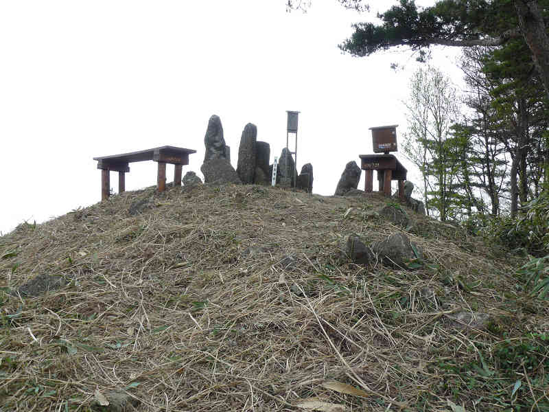 山頂の王院墓 王院山山頂から眺める展望(動画) 周囲を見回せば、黄砂煙る展望が続き、北東方面には大袋山と稗原要害山が尖峰を見せている。西峰(三瓶展望地)の案内に従い南西方面へ向かう。笹が刈られてとても歩き易く、地元の皆さんのご厚意に頭が下がる。少しずつ高度を上げながら進んで行くと、前方に植林帯が現れ、この植林帯の先から少し高度を下げれば、笹の刈られた展望地に着いた。