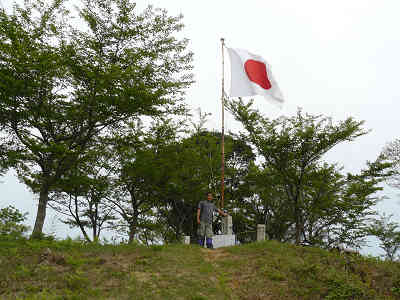 掃き清められて綺麗な道を登れば、間もなく日章旗棚引く山頂へ到着。山頂に立ち、周囲に広がる展望を眺めればこれはすごい、南西に霞んでいるのは北九州の風師山・戸上山・足立山と続く山脈、関門海峡を挟んで下関側には火の山・霊鷲山、一旦稜線を落として長府権現山・四王司山・勝山、更に鉄塔の建つ表山が続き、西の奥には一際高い竜王山がそびえ、右の手前には雄笠山と雌笠山も眺めることができる。