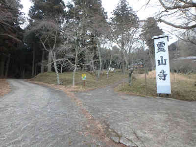 そのまま道なりに進み、途中に掲示されている案内に従い進むと、間もなく登山口の霊山寺だ。霊山寺の駐車場に車を置いてまず霊山寺本堂へ参拝、登山の無事を祈願する。お寺の北へ続く道を進むと作業道に出るので丁字路を右折。舗装された道の周囲には植林帯が続き、やがて右側からは霊山寺のもう一方からの道が合わさる。