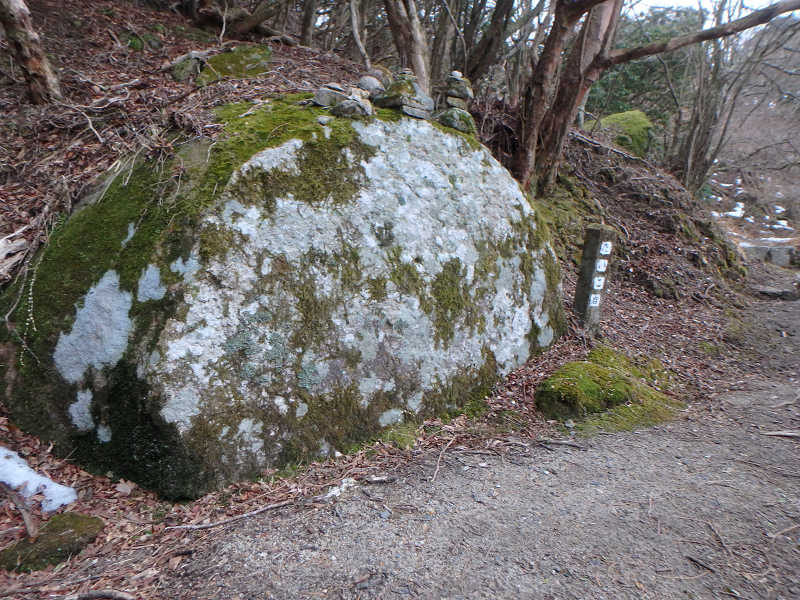 背後には樹間越しに伊賀市内の展望が開けるものの、見えている場所はよく分からない。ベンチの置かれた休憩所を通過、植林帯の下を辿れば三合目600mの案内を過ごす。苔むす岩などを眺め、良く踏まれた道を辿る。登山道は明確なので道に迷う心配は全くない。