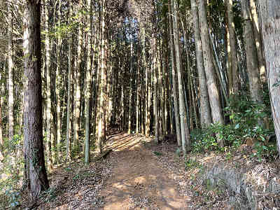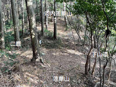 明確な本コースを下っているとひよどり越えの交差点へ着く。左は二鹿へ、直進は河内蓮華山へ続いている。ここでは下山なので分岐を右折する。さすがに本コースと言うだけあって、快適な下りが続く。途中で市の迫観音堂への分岐(尾根コースとの分岐)を過ごし、左右に大きく蛇行しながら高度を下げる。やがて足下に不安定な石が増え、滑りやすくなるため慎重に高度を下げる。
