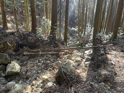 更に進むと左右の分岐に着き、右は蓮華山本コース、左は市の滝観音経由と案内されていた。ここで分岐を右折すれば本コースに入ることもできるが、そのまま市の迫観音堂へ向かう左の分岐に向かう。植林の下を進むと鉄パイプで作られた橋を渡る。これから先登山道は岩のゴロゴロした状態が続き、数年前にこの付近では土石流が発生したようだ。不安定な岩の続く道を辿り、少しずつ高度を上げる。