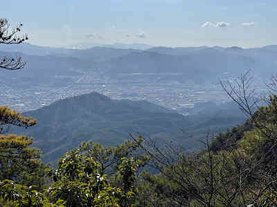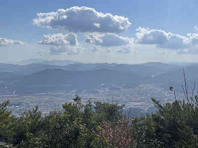 山頂には祠が二基祀られており、手水の置かれたかつての神社跡は樹林の下にある。山頂から玖珂の街並みは樹間越しであり、北にそびえる中国山地の山々もやはり樹間越しに広がっていた。そこで展望の良い西峰展望台へ移動する。