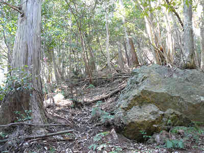 この前を通り抜け、階段を登って先へ進むと正面に不動明王が祀られており、左には木の橋が二つ架けられている。六部山へは、この木の橋を渡って尾根に向かえば、今なら植林の枝打ちなどにより周辺が整備されているため、とても歩きやすくなっている。