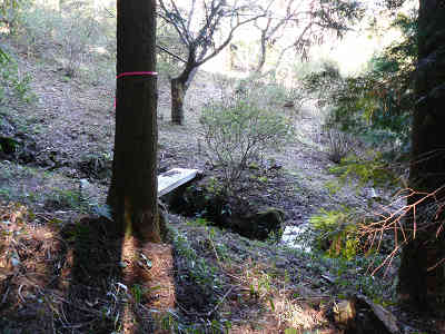 明るい六部山山頂 三角点の先を確認すると、更に踏み跡は奥へ向かって進んでいるように見えた。山頂を出発し、元来た道を引き返す。下山は植林帯と自然林の間を忠実に下る。そして着いたところは、前述の不動明王が祀られた、二つの橋の架けられた場所だった。