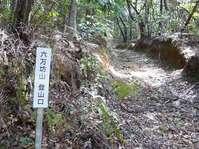 林道を少し奥へ進むと、主路は右へカーブするが、直進方向へ続く山道に入る。なお、この入口には「六万坊山登山口」の案内が立っている。この先いくつかの分岐を見るが、主路を進めば大丈夫。途中で竹林帯を抜け、足下に地積調査の杭が目立つ頃には、周囲の植生が自然林へ変わる。