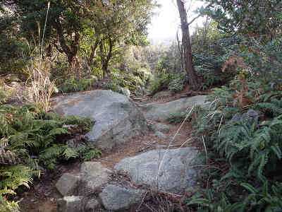 トップに戻る 2015年に登った山リストへ戻る 山名アイウエオ順 2015年2月28日 登山口 →0:30→ 佐野山分岐 →0:10→ 佐野山山頂 →0:07→ 分岐 →0:20→ 陵厳寺山頂 →0:15→ 分岐→0:18→登山口 全歩行時間 1時間40分 中国山地にはまだ雪が残っていそうなので、山口県の瀬戸内海側の山歩きを続けている。今回は以前黄砂などの霞により撤退した、防府市の楞厳寺山へ向かう。山陽自動車道の防府東インター付近から防府バイパスを西へ進み、防府西高校の分岐に入る。正面(北)に高校を見て道なりに右方向へ進路を採れば、この付近に楞厳寺山への案内が設置されており、案内に従い道なりに進むと、簡単に登山口へ着くことができる。 右に岩淵山観音寺を過ごし、次の分岐を右折し、高速道路の高架先の丁字路は左折する。左に山陽自動車道を眺めながら西へ進むと、右に畑、左に山陽道の高架15があり、この地点が楞厳寺山の登山口である。車両通行の邪魔にならない場所に駐車して登山を開始する。 進行方向に楞厳寺山の山頂を眺めながら作業道を進めば、右に堰堤を過ごす。更に道なりに進むと左右にシダの茂る登山道に入り、足下に大岩などを眺める。明るい自然林の下につけられた緩やかな傾斜をのんびり進む。頭上には山頂部が樹間越しに見える時もあるが、まだまだ遠い。