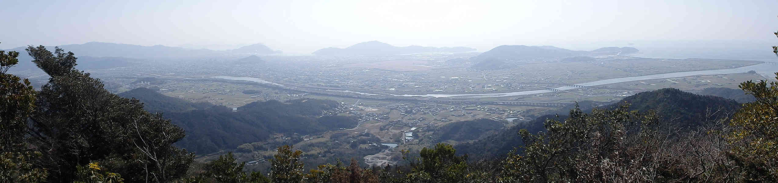 西には大海山や火の山連峰がそびえており、ただ登山道を歩いているだけで楽しくなる。緩やかな傾斜の道はすくに終了し、次は山頂へ向かう急登が待っている。ロープを補助に急な斜面を登り、大岩の間を縫って進む。岩上に立てば、眼下に広がる展望は素晴らしいの一言に尽きる。 周囲に広がる展望を眺めながら一気に高度を上げれば、すぐに平坦な山頂に到着。中央に三等三角点の置かれた山頂からは、場所を変えながら感動的な展望を楽しむことができる。東には西目山と右田ヶ岳、その先に矢筈ヶ岳と大平山が続く。 南の平野には防府市街が広がり、佐波川の注ぎ込む大海湾、西へ向かって大海山に火の山連峰・花ヶ岳と明るい展望を独り占め。いつまで眺めていても見飽きない美しい景色である。最後に三角点にて記念撮影を終了、楞厳寺山の山頂はとても明るく景色も素晴らしい山である。 下山をしようとしたら周南市のご夫婦が山頂へ到着、下山の最中にも宇部市からのグループが12名など楞厳寺山は人気ある山であることが分かった。楞厳寺山の登山口を出発、次に向かうのは周南市湯野にそびえる城山で、コンビニでおむすびでも買って昼食にしようかと思っていたら、椿峠でラーメンショップという看板が目についた。