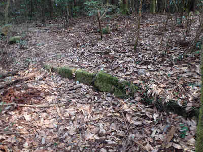 この先で一回目の沢を渡り、沢を右に眺めながら進む。左には耕作地跡のような場所があり、水路の跡らしき溝も確認することができた。足下に石組みなど生活の跡を感じながら奥へ向かう。