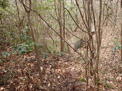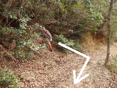 やがて平坦な場所に着けば、地籍調査の杭と炭焼き窯跡が現れた。この先からは快適な自然林を辿ることになる。目印のテープをびっしり貼りながら進むと、イノシシ除けのトタン板が見えてきた。人工物が見えてくれば終点は近く、間もなく作業道へ到着した。