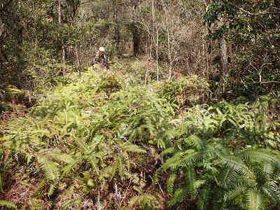 明確な尾根道歩きが始まるものの、きついシダとの戦いも始まる。最初はシダを避けて巻き道を採ろうとしたが、尾根を外し気味となるので、そのまま尾根へ向かう。シダ道の急登は滑り易く、苦労しながら道を作る。それでもかまわず進んでいると、背後には明らかな登山道ができている。