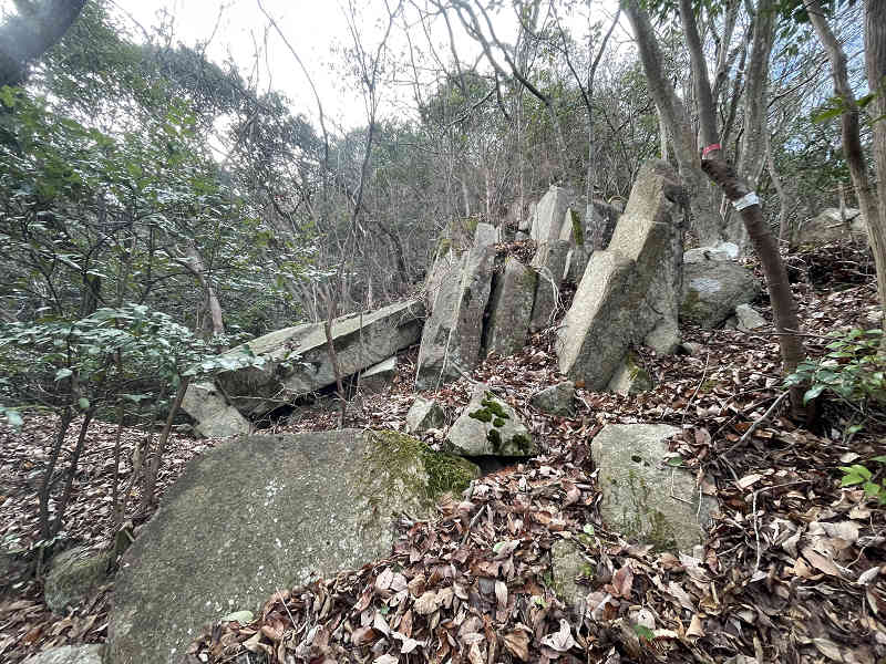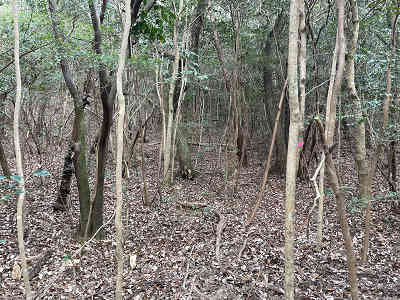 昨年配置した目印テープに従い西へ進み、山頂へ向かって直登する。今回のコースは登山口から境界林道ルートの案内標識まではファミリーコースで危険箇所は無い。次のガレ場だがほとんどの場所に補助のロープが渡されているため危険度は少ない。ただし、最後の直登コースにはロープは無く、木々を掴みながら落葉で滑りやすい急斜面にとりつく。