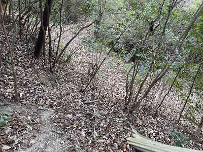山頂から西尾根コースに入り、最初に現れるのが境界林道ルートで、更に坂を下れば虎ロープが左下に続いている。谷コースはこのロープの反対(右下)に続いている。正面コース同様木を手がかりにブレーキを掛けながら高度を下げる。進路は左の山腹に続き、足下が滑りやすいので注意を要す。