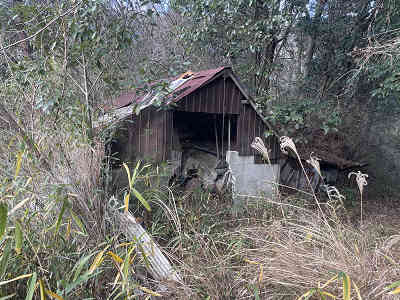 やがて足下に懐かしい波板トタンが見えてくれば、左下に林道から続く道が現れた。出入口付近に目印テープを配置して林道へ向かう。と、この先で道には笹が茂って歩き難くなっていた。笹を分けながら進むと左にはかつての耕作地が広がっているが、現在は耕作放棄地に変わっていた。