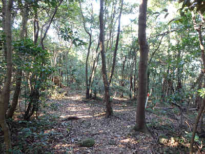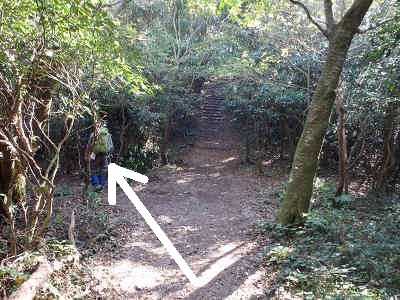 牝鋤先山を出発、北へ向かって進路を採れば、樹間越しにこれから向かう牡鋤先山を見つける。ここでわずかに坂を下り、すぐに登り返す。自然林の間に整備された擬木の階段が続いている。坂の傾斜が急なので一気に高度が上がり、全く無駄な作業なしに山頂へ向かっていることがわかる。