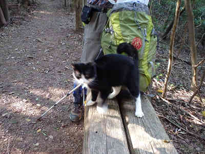 第3分岐点の手前には休憩用のベンチが置かれており、一休みしようかと思っていたらどこからか黒猫が現れ、えさをねだってきた。お菓子を与えるとおいしそうに食べていたが、この猫はまるまると太っているのでこの付近にえさが豊富にあるのかもしれない。第3分岐を進んだ先のピークは388ピークで、この先からはしばらく迂回路の区別がつかなくなる。