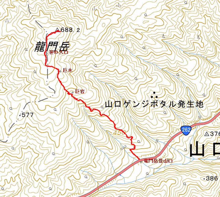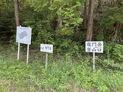 登山口へ向かう起点を山口県立大学付近とすれば、国道9号を東へ進みます。仁保入口交差点で進路は北に変わり、木戸山トンネル手前を左折し、国道262号に入ります。国道262号を約1km進むと、右に竜門岳の登山口が見えてきます。登山口には数台程度の駐車スペースがありますので、邪魔にならない場所に車を置き、登山を開始します。