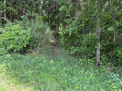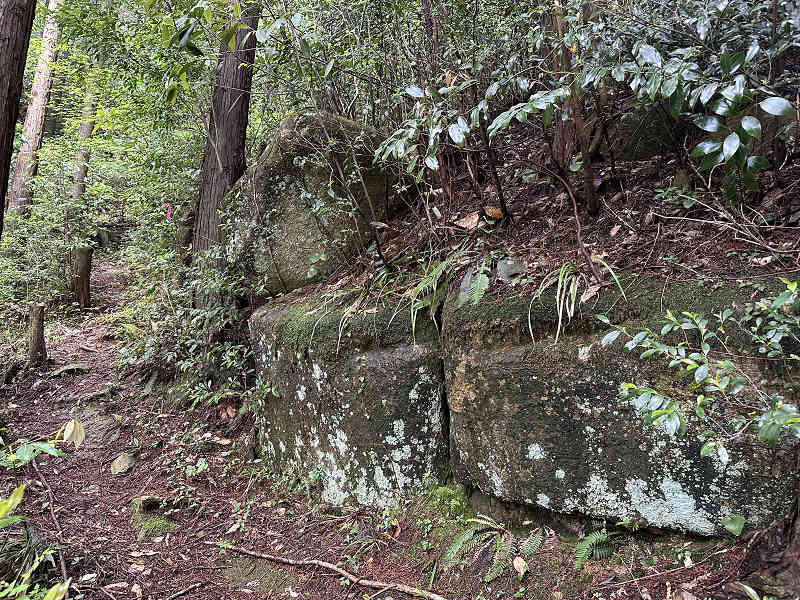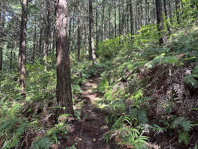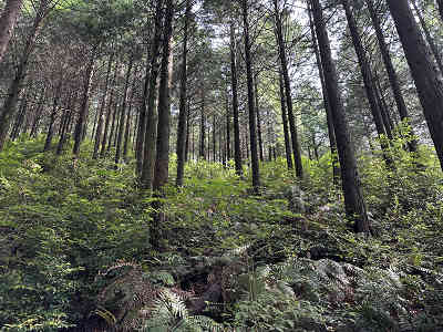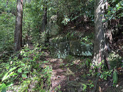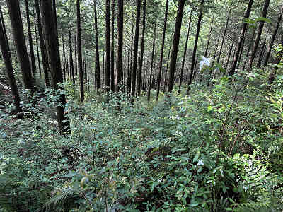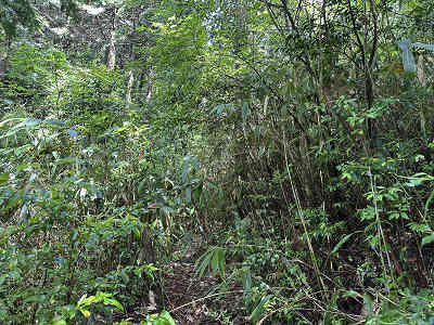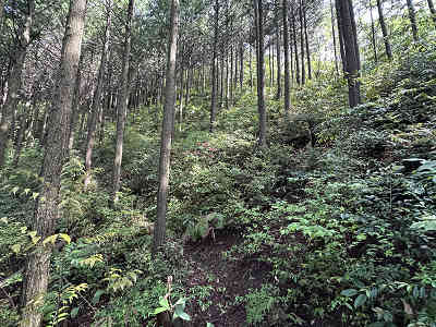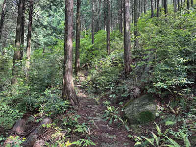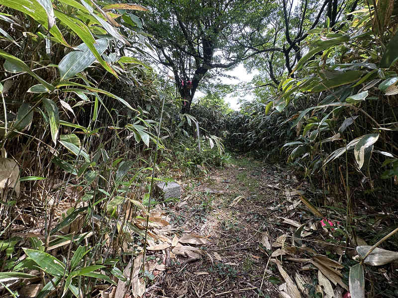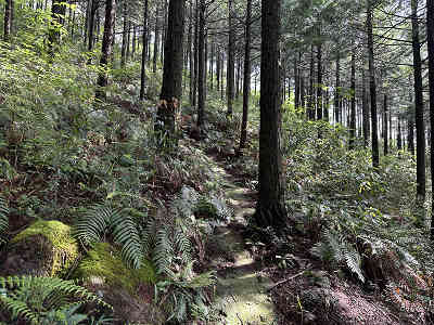 登山道入口は少し奥側にあり、入口には目印テープが巻かれています。登山道に入りますと周囲はヒノキの植林帯で、足下付近には細い竹が目立ちます。登山道自体はよく踏み固められており、安心できそうですが、苔が多く、下山時には滑りそうなので注意が必要です。