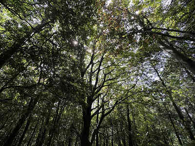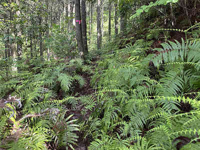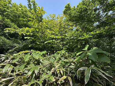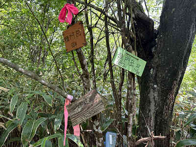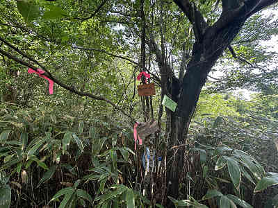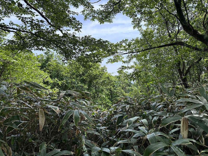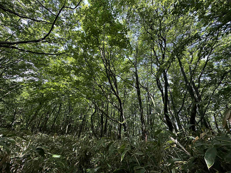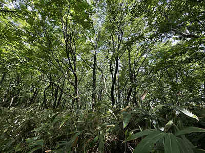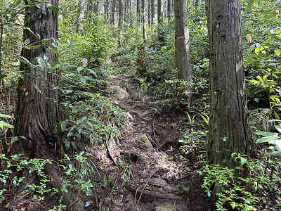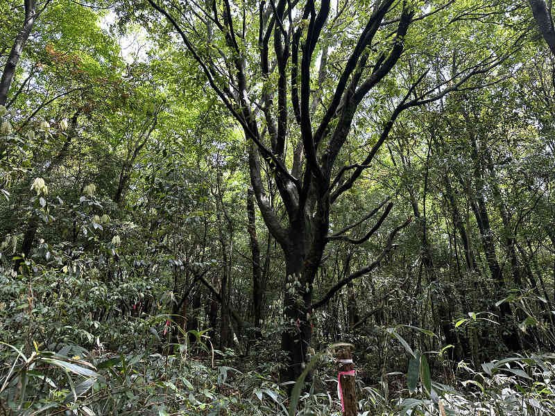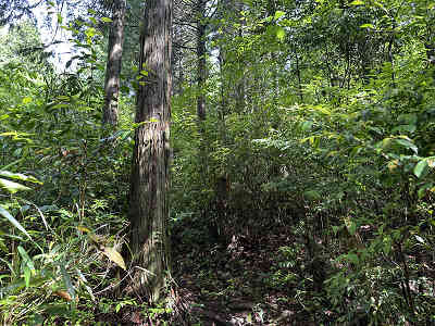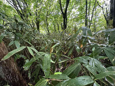 それまで歩きやすかった登山道には笹が目立ち始め、しかも笹が濡れているため、次第にズボンもずぶ濡れ状態となります。前方に巨木が現れたのでしばらく観賞し、この木の下に着くと、それまでの植林帯から自然林に周囲の植生が変わり、笹も無くなりました。周囲の植生の変化がこれほどまでに環境を変えることに驚きます。