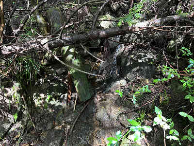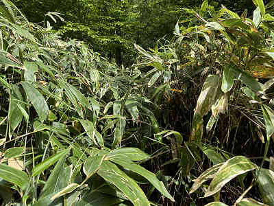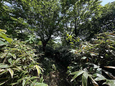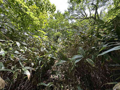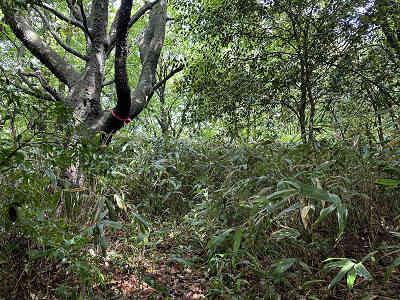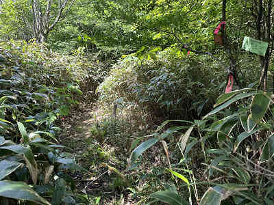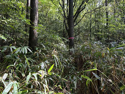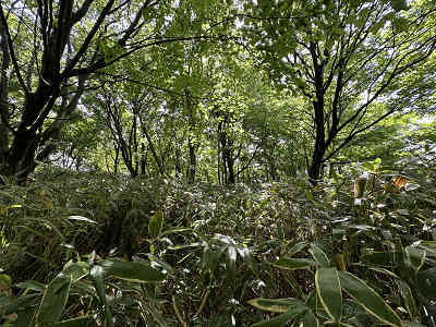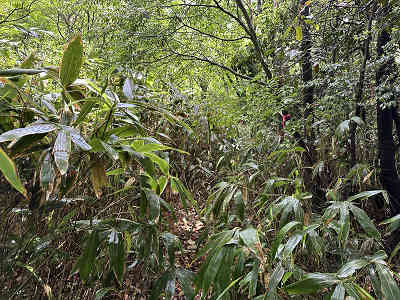 最初はわずかな距離と思っていたら、次第に笹の背が高くなり、前方が見えなくなります。ただし、笹の下に踏み跡は続いているので、踏み跡に従って慎重に進みます。突然踏み跡が消えたので周囲を見回すと、進路は少し右に変わっていました。