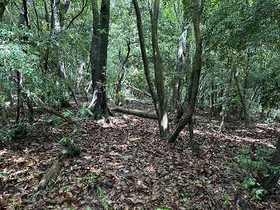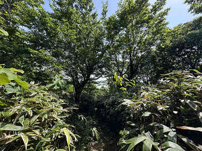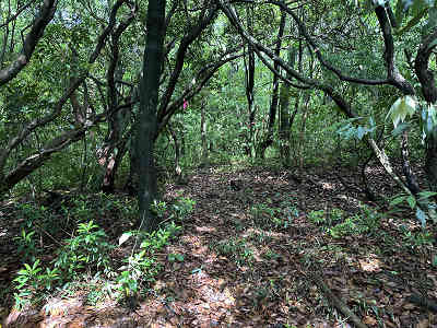 登山道は山頂に向かって直登ではなく、巻き道のように続くつづら折りになっているため、疲労感は少ないです。木漏れ日差す登山道をゆっくり登り、山口市街の方向を眺めると、植林の背が高くなっため、20年前に眺めた展望は無くなっています。