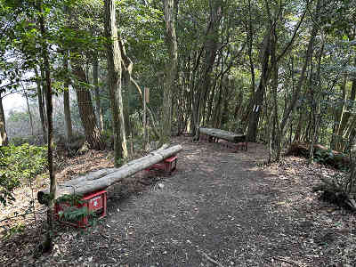 雄鋤先山を出発し、急な坂を下れば急登コースの「T字路ベンチ」に着きます。ベンチに名前をつけることにより、山林火災や救急・救助活動等に利用できるそうです。なお、このベンチの右から急登コースが合流しています。T字路ベンチを過ぎ、鞍部に下ると、やはり右側から急登コースが合流します。