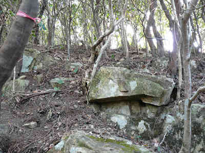 やはり茨などが多いので、障害物競走のように歩きやすい場所を選びながら進む。岩の多い場所に着き、大岩の上に立てば、眼下に出発した付近を眺め、遠くには狗留孫山や華山などの展望が広がる。ここでヤブを抜けてきたご褒美のような素晴らしい展望を楽しむ。