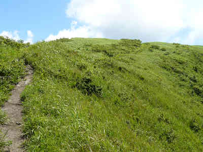 進行方向には先ほどまで見下ろしていた子三瓶山が高くそびえており、いったい今日の体力で登れるものかと少々弱気になる。それでも草原の山は美しく、この山頂に立ってみたいという気持ちの方が勝っている。やはりこの登山は富士山のお鉢回りのトレーニングにぴったりである。