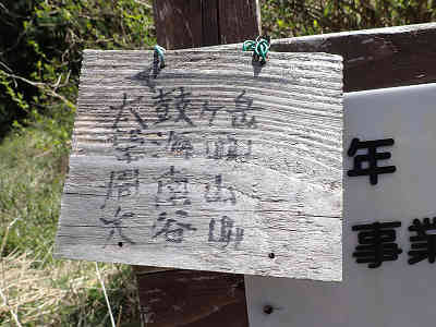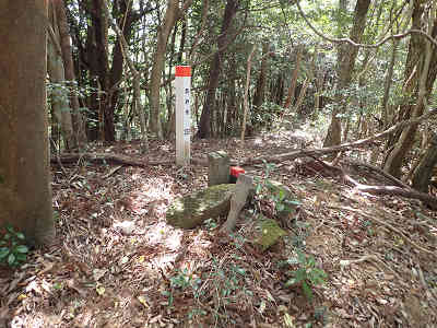 三上山を出発し縦走路を南へ向かう。この先周囲に展望はなく、ただアップダウンが続く。大して変化の無い道だが植林帯と自然林等の植生の変化を感じながら進むと突然プラスチック製の防府市282の案内が現れた。これは石杭の代わりに置かれた物だろう。