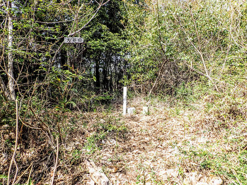 三等三角点の置かれた山頂からは展望は樹幹越しで、やはり期待できるものでは無かった。これで本日残すのは松尾山のみ。大谷山を出発し一旦坂を下って登り返す。登り返したところで左右の道があり、松尾山へ行かなければ左道の方が近道である。松尾山への登山の可能性を残すため、右道をとり野峠へ向かってみた。