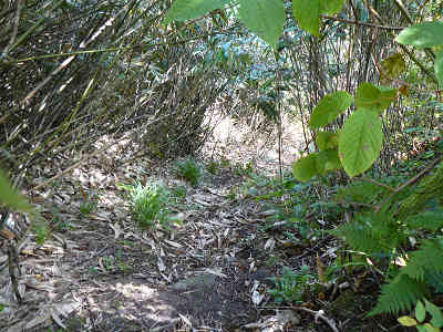 こんな事は初めての経験、あまりに急な斜面なので、背中に背負ったリュックの重さを実感し、リュックが下に向かって引っ張られるような感じを受ける。それほど急な斜面を下りている。ストックで足下を確認しながらもう一方の手で笹などをつかみ、ブレーキをかけながら下りる。