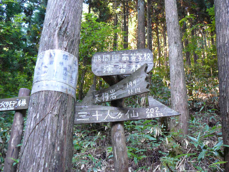分岐の中央に設置された三十人ヶ仙の標識に従い、右の林道へ進路を採る。鎖の渡された場所を抜け、最初のコンクリートの橋を通過、この先で左右に分岐が現れるので、案内に従い左の道へ向かう。再び鎖の渡された場所を抜け、左右に小学校の演習林を過ごせば、この先には休憩舎のような建物が設置されている。