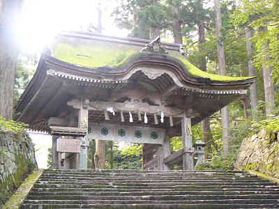 右手には延命長寿の御神水が流れているので、たっぷりと頂く。この御神水は冷たくて美味しいのでコップに3杯飲み干した。本日リュックの中には水が約5リッター、途中に水場が無いようなので、水はとても貴重なのだ。御神水を過ごすと苔むした階段道が現れ、その奥には大神山神社の山門が見えている。山門の屋根に付いた苔がとても美しく、とても良い感じだ。