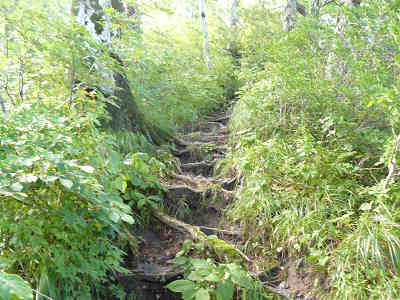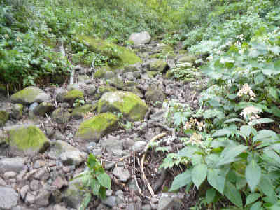 今まで経験したことのない登山道に感激しながら進んでおり、前方を見上げればユートピアの避難小屋が遠くに見えてきた。進行方向にはなんか三角形の鉄骨が立っている。これは「勝間ケルン」というそうだ。滑りやすい登山道を抜けて行くと、勝間ケルンの下付近からは草木の茂る登山道となり、足下が見えにくく、慎重に足下を確かめながら行かないと躓いてしまう。