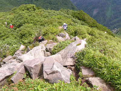 象ヶ鼻下の分岐から振子沢・野田ヶ山方面に向かって急な斜面を下りて行くと、すぐに沢山の花と出会うことができた。この周辺にも沢山の花が咲いており、しばらく観賞することにする。象ヶ鼻方面を見上げると綺麗な花が咲いていることがわかり、ここから眺める周囲の展望も素晴らしい。