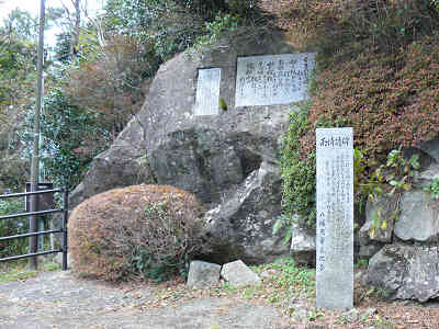 雨情道路の案内に従い整備された道を下ると、雨情詩碑が置かれている。案内によれば、「青い目のお人形、からす、あの町この町、雨ふりお月さん、こがねむし」などの童謡を作られた詩人野口雨情は、昭和7年5月に門下阿南哲朗と帆柱山へ登り、神功皇后西征による伝説を聞き、帆柱山『くきの海辺の船もよい 船も帆がなきゃ行かれない お供についたくまわにが 山で帆柱きりました その時きった帆柱は 帆柱山の杉でした』の詩を作った。「くきの海辺」は、洞海湾のこと、「くまわに」とは土地の豪族熊鰐のことである。