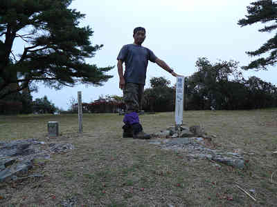 権現山の山頂風景 舗装道を辿れば間もなく権現山の山頂へ到着、広い山頂の中央付近には権現山の山頂標識と二等三角点が置かれている。皿倉山方面には展望台が設置されているものの、老朽化しているためか立入は規制されている。三角点の前で記念撮影の後、西の展望台へ向かってみる。