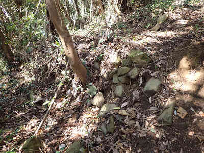 平坦な道を少し進み、わずかに坂を下ると五条分かれに着いた。案内には戦争遺構まで800m、佐蓮山山頂まで1300m、佐蓮石風呂まで400m、佐蓮登山口まで600mと書かれていた。背後に沖家室島を眺めて五条分かれを出発、坂へ向かうと平坦な耕作地を作るための石組みが続いていた。